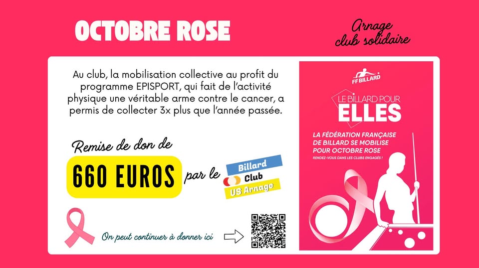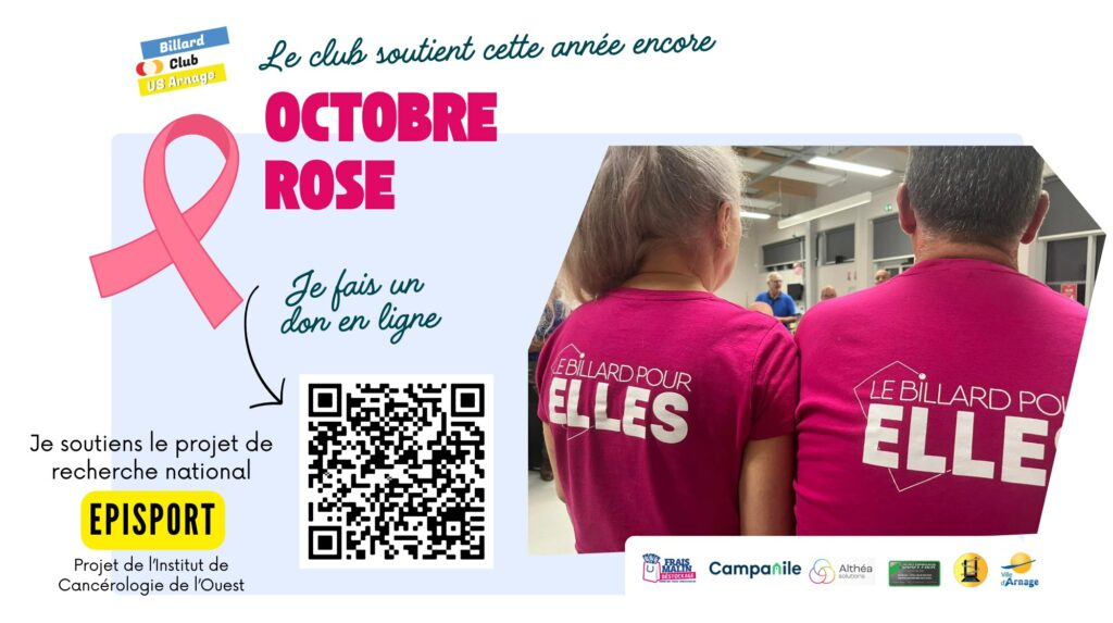 Le club d’Arnage est très reconnaissant de pouvoir te compter comme membre engagé, dévoué et au service de la formation de toutes et tous !Ce mois-ci, le club est très heureux de prendre part à une opération fédérale de lutte contre le cancer du sein, née au sein de la Ligue de Billard des Pays de la Loire